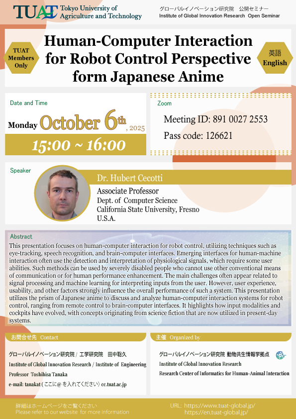 Title | "Human-Computer Interaction for Robot Control Perspectives from Japanese Anime" <Abstract> This presentation focuses on human-computer interaction for robot control, utilizing techniques such as eye-tracking, speech recognition, and brain-computer interfaces. Emerging interfaces for human-machine interaction often use the detection and interpretation of physiological signals, which require some user abilities. Such methods can be used by severely disabled people who cannot use other conventional means of communication or for human performance enhancement. The main challenges often appear related to signal processing and machine learning for interpreting inputs from the user. However, user experience, usability, and other factors strongly influence the overall performance of such a system. This presentation utilizes the prism of Japanese anime to discuss and analyze human-computer interaction systems for robot control, ranging from remote control to brain-computer interfaces. It highlights how input modalities and cockpits have evolved, with concepts originating from science fiction that are now utilized in present-day systems. |