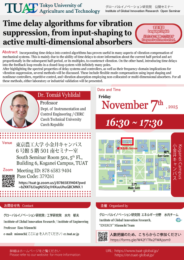 | Speaker | Dr. Tomáš Vyhlídal <Biography> Tomáš Vyhlídal received his Ph.D. in Control and Systems Engineering in 2003 from the Faculty of Mechanical Engineering (FME) at the Czech Technical University in Prague (CTU). In 2012, he was appointed Professor at CTU. Since 2000, he has been with the Department of Instrumentation and Control Engineering at FME-CTU, where he has served as Head of the Department since 2019. Since 2015, he has also been affiliated with the Czech Institute of Informatics, Robotics and Cybernetics (CIIRC) at CTU. His research interests include the analysis and control of time-delay systems, mathematical modelling, and applied control theory. He has coordinated several projects focusing on the application of time-delay algorithms for flexible mode compensation and vibration suppression. Currently, he serves as a Research Area Leader in the ROBOPROX.EU project, focusing on the control of distributed-parameter systems and complex robotic structures. Since 2013, he has been a member of the IFAC Technical Committee on Linear Control Systems, serving as Vice-Chair for Industry from 2017 to 2023 |