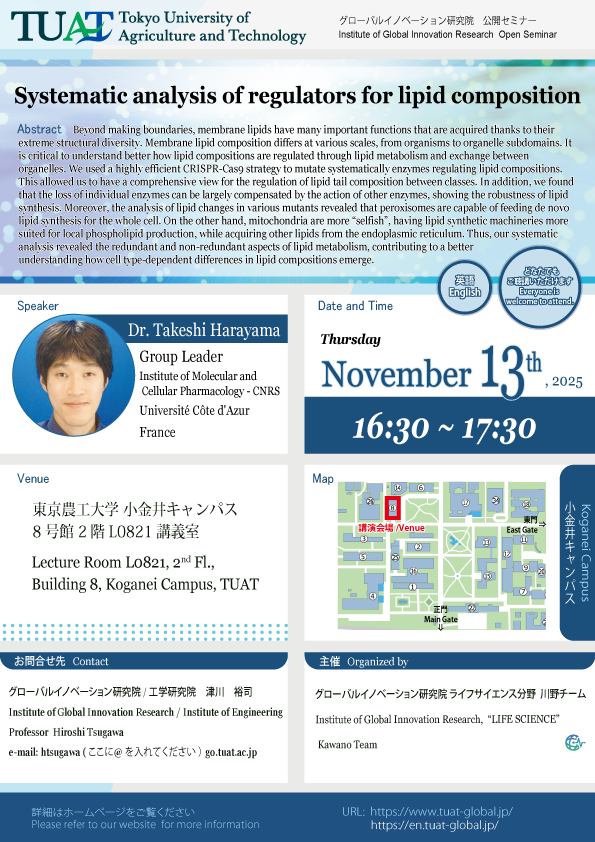 | Title | "Systematic analysis of regulators for lipid composition" <Abstract> Beyond making boundaries, membrane lipids have many important functions that are acquired thanks to their extreme structural diversity. Membrane lipid composition differs at various scales, from organisms to organelle subdomains. It is critical to understand better how lipid compositions are regulated through lipid metabolism and exchange between organelles. We used a highly efficient CRISPR-Cas9 strategy to mutate systematically enzymes regulating lipid compositions. This allowed us to have a comprehensive view for the regulation of lipid tail composition between classes. In addition, we found that the loss of individual enzymes can be largely compensated by the action of other enzymes, showing the robustness of lipid synthesis. Moreover, the analysis of lipid changes in various mutants revealed that peroxisomes are capable of feeding de novo lipid synthesis for the whole cell. On the other hand, mitochondria are more “selfish”, having lipid synthetic machineries more suited for local phospholipid production, while acquiring other lipids from the endoplasmic reticulum. Thus, our systematic analysis revealed the redundant and non-redundant aspects of lipid metabolism, contributing to a better understanding how cell type-dependent differences in lipid compositions emerge. |