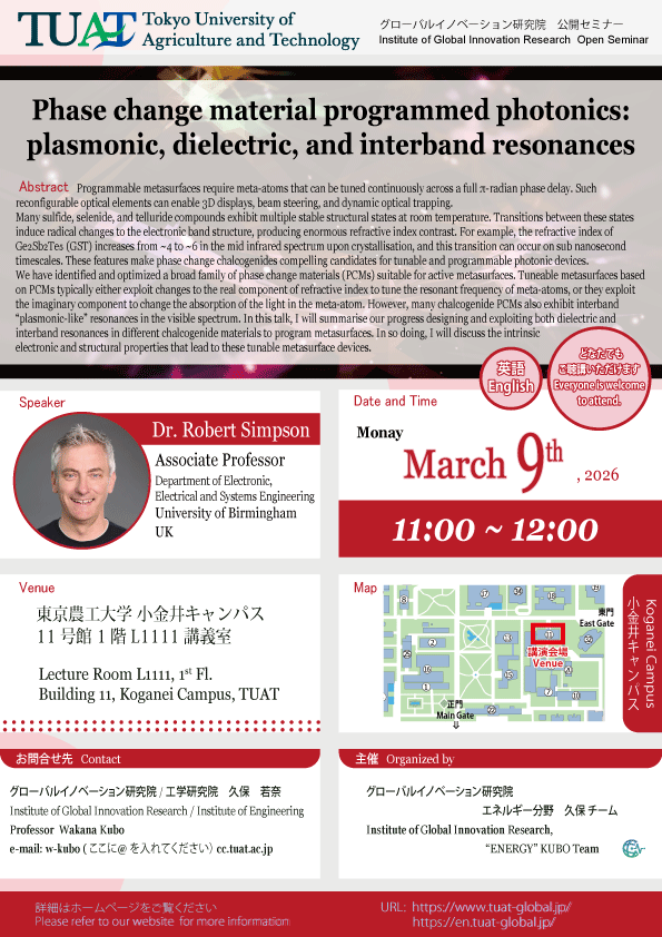 | Contact | Institute of Global Innovation Research, Institute of Engineering Prof. Wakana Kubo e-mail: w-kubo ( at ) cc.tuat.ac.jp |