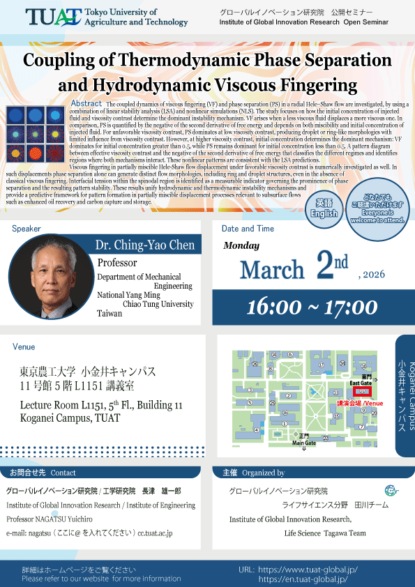 | Title | "Coupling of Thermodynamic Phase Separation and Hydrodynamic Viscous Fingering" <Abstract> The coupled dynamics of viscous fingering (VF) and phase separation (PS) in a radial Hele–Shaw flow are investigated, by using a combination of linear stability analysis (LSA) and nonlinear simulations (NLS). The study focuses on how the initial concentration of injected fluid and viscosity contrast determine the dominant instability mechanism. VF arises when a less viscous fluid displaces a more viscous one. In comparison, PS is quantified by the negative of the second derivative of free energy and depends on both miscibility and initial concentration of injected fluid. For unfavorable viscosity contrast, PS dominates at low viscosity contrast, producing droplet or ring-like morphologies with limited influence from viscosity contrast. However, at higher viscosity contrast, initial concentration determines the dominant mechanism: VF dominates for initial concentration greater than 0.5, while PS remains dominant for initial concentration less than 0.5. A pattern diagram between effective viscosity contrast and the negative of the second derivative of free energy that classifies the different regimes and identifies regions where both mechanisms interact. These nonlinear patterns are consistent with the LSA predictions. Viscous fingering in partially miscible Hele-Shaw flow displacement under favorable viscosity contrast is numerically investigated as well. In such displacements phase separation alone can generate distinct flow morphologies, including ring and droplet structures, even in the absence of classical viscous fingering. Interfacial tension within the spinodal region is identified as a measurable indicator governing the prominence of phase separation and the resulting pattern stability. These results unify hydrodynamic and thermodynamic instability mechanisms and provide a predictive framework for pattern formation in partially miscible displacement processes relevant to subsurface flows such as enhanced oil recovery and carbon capture and storage. |
