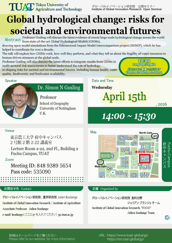 | Contact | Institute of Global Innovation Research, Institute of Agriculture Assoc. Prof. Julien Boulange Email: boulange(at) go.tuat.ac.jp |