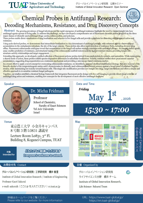 | Title | "Chemical Probes in Antifungal Research: Decoding Mechanisms, Resistance, and Drug Discovery Concepts" <要旨> The growing prevalence of fungal infections and the rapid emergence of antifungal resistance highlight the need for deeper insight into how antifungal agents operate in living cells. To address this challenge, we have developed a comprehensive set of fluorescent chemical probes modeled on the three major classes of clinically used antifungal drugs: azoles, echinocandins, and polyenes. These probes enable direct visualization of drug localization and behavior in live fungal cells and provide a platform for dissecting mechanisms of action and resistance. Using azole-derived probes, we demonstrate that intracellular localization is a key determinant of antifungal potency, with enhanced activity observed upon accumulation in the endoplasmic reticulum, the site of the target enzyme. These probes also allow rapid detection of resistance traits, including elevated drug efflux. Fluorescent echinocandin analogues reveal that accumulation at the fungal cell surface strongly correlates with antifungal efficacy. An imaging-based uptake assay enables prediction of resistance, and structural tuning of the echinocandin scaffold restores activity against resistant strains, providing insight into structure-activity relationships and target engagement. Extending this approach, we developed a unified collection of fluorescent polyene probes derived from amphotericin B, nystatin, and natamycin. While maintaining a shared mode of action, these probes exhibit species-dependent differences in subcellular localization. Notably, resistant strains show pronounced vacuolar accumulation, suggesting drug sequestration as a resistance mechanism and providing a microscopy-based resistance marker. In a recent effort to apply a novel concept for overcoming echinocandin resistance, we identified a minimal chemical modification strategy. Selective removal of the benzylic alcohol of the nonproteinogenic amino acid L-homotyrosine in clinically used echinocandins restores potency against a broad panel of resistant Candida strains, while maintaining low toxicity toward human cells. This single-site modification provides new insight into drug–target interactions and offers a simple and effective approach to re-sensitize resistant fungal pathogens. Together, our studies establish a chemical biology framework that integrates fluorescent probe design with live-cell imaging to provide direct visual evidence of antifungal drug action and resistance, enabling new concepts for the development of more effective antifungal therapies. |